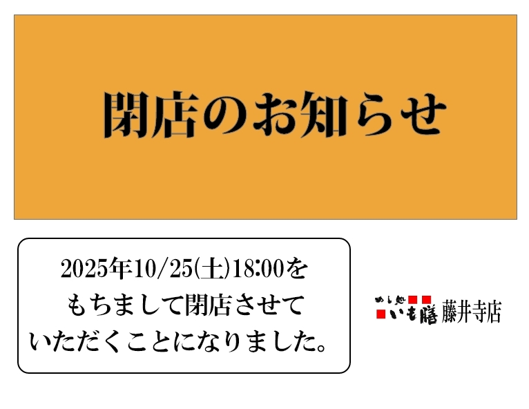 長らくご愛顧いただきましたいも膳藤井寺店は、このたび 2025年10月25日(土)18:00をもちまして閉店させていただくことになりました。 賜りましたご厚情 誠に有難うございます 従業員一同心より厚くお礼申し上げます 本当にありがとうございました。